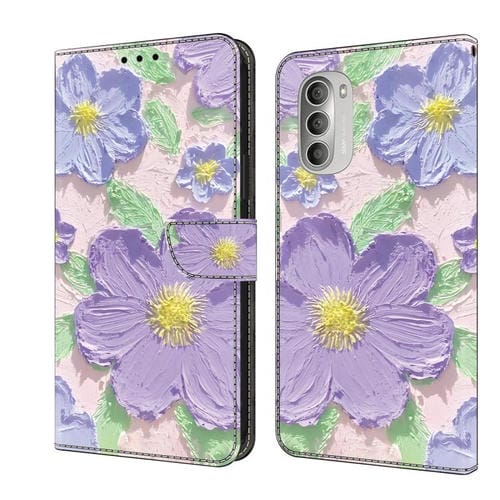Funda de Cuero Pintada a Mano para Motorola Moto G51 con Flores Moradas (Pintura al Óleo)