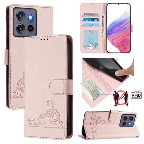 Funda de Cuero RFID para Motorola Edge 50 Neo con Cordón Estampado Gato y Rata (Rosa)