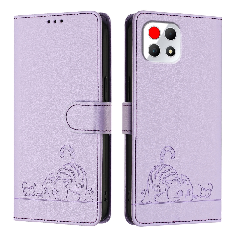 Funda de Cuero Rfid con Relieve de Rata de Gato para T-Mobile Revvl 7 5G con Cordón (Morado)