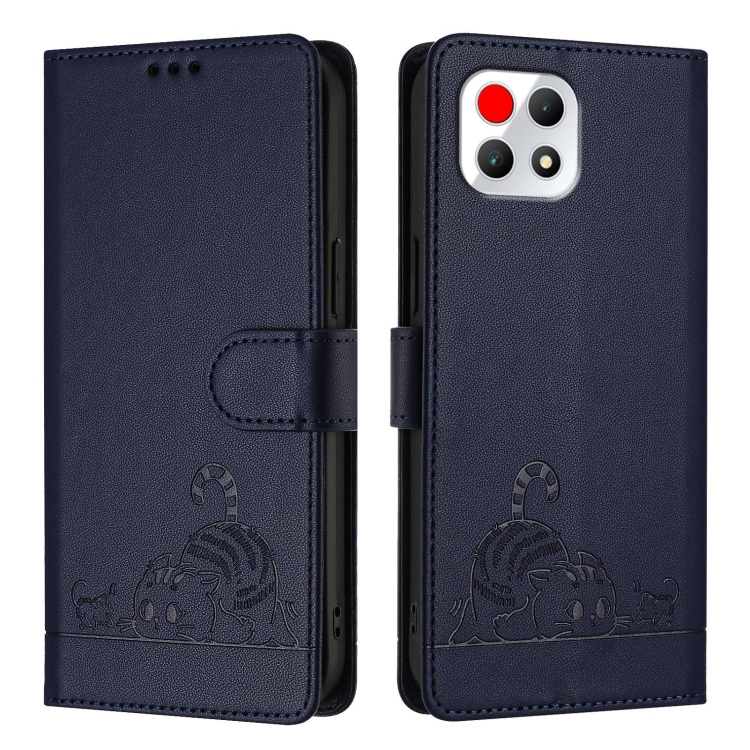 Funda de Cuero Rfid con Relieve de Rata y Gato para T-Mobile Revvl 7 5G con Cordón (Azul)