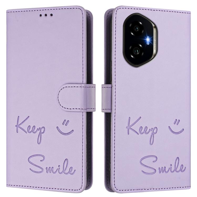 Funda de Cuero Rfid con Relieve Sonriente para Teléfono Honor 300 5G (Morado Claro)