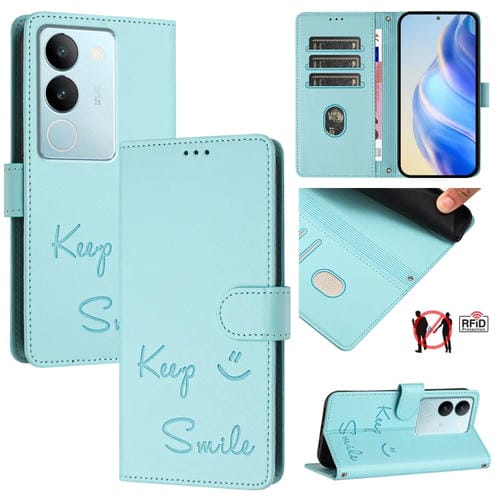 Funda de Cuero Rfid con Relieve Sonriente para Vivo V29 5G Global/V29 Pro (Verde Menta)