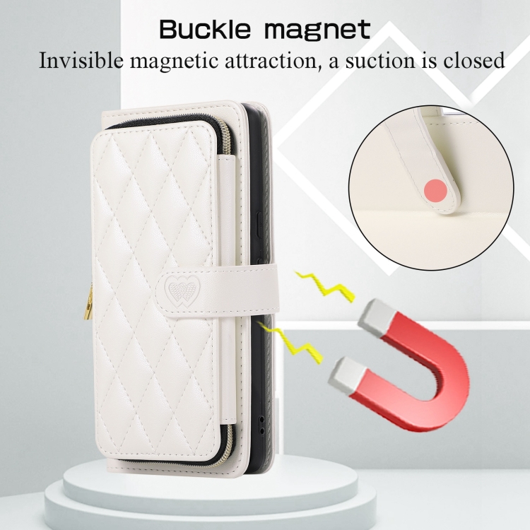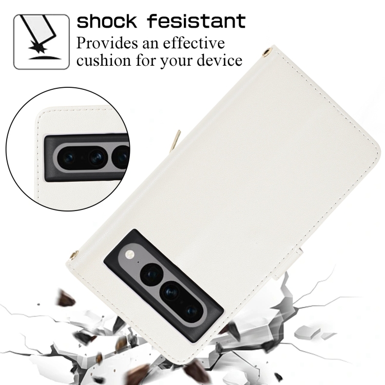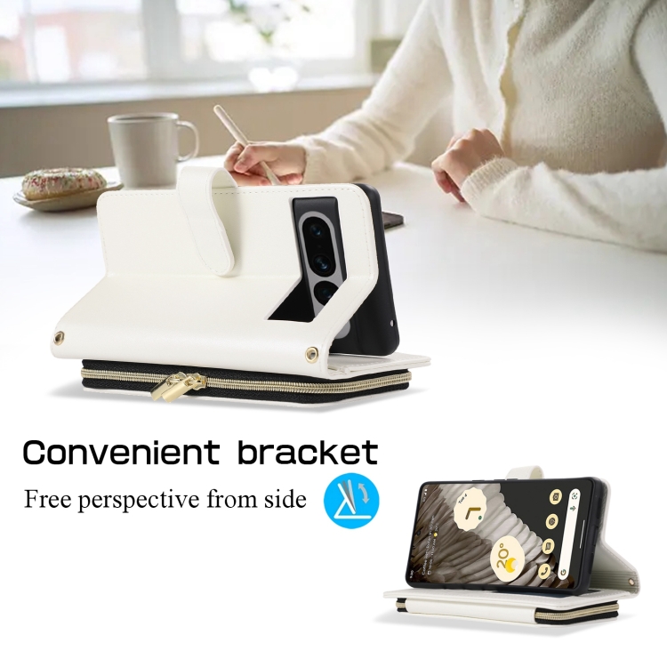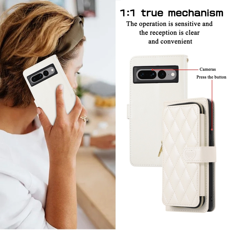 Funda de Cuero Tipo Billetera con Cremallera Completa y Diseño Rombal para Google Pixel 7 Pro (Blanca)
