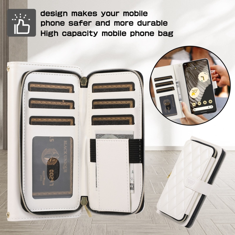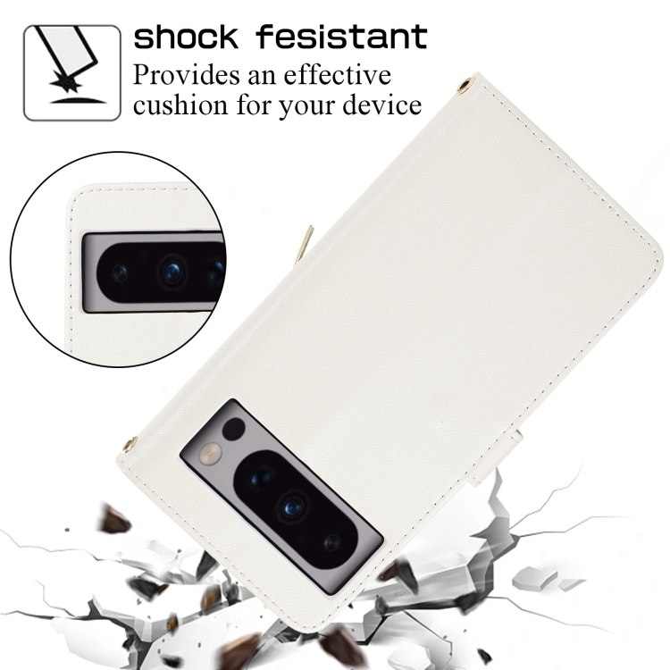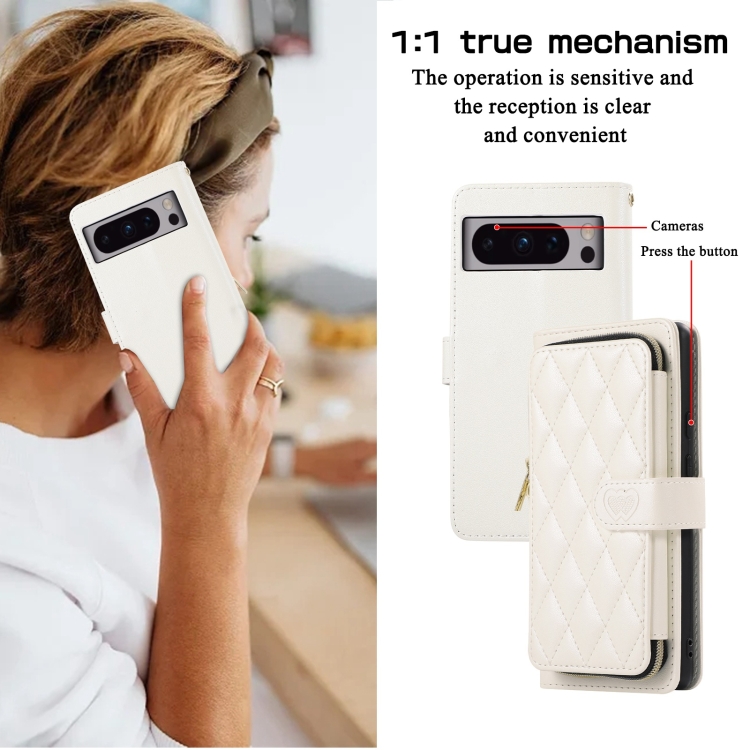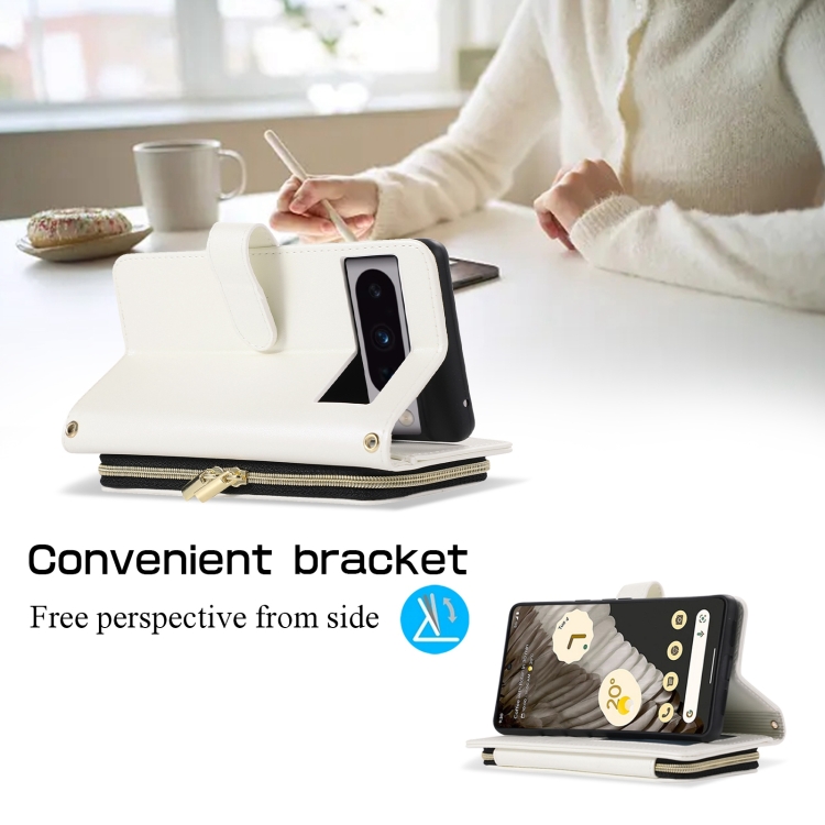 Funda de Cuero Tipo Billetera con Cremallera Completa y Diseño Rombal para Google Pixel 8 Pro (Blanca)