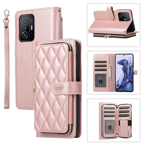Funda de Cuero Tipo Billetera con Cremallera Completa y Diseño Rombal para Xiaomi Mi 11T/11T Pro (Oro Rosa)