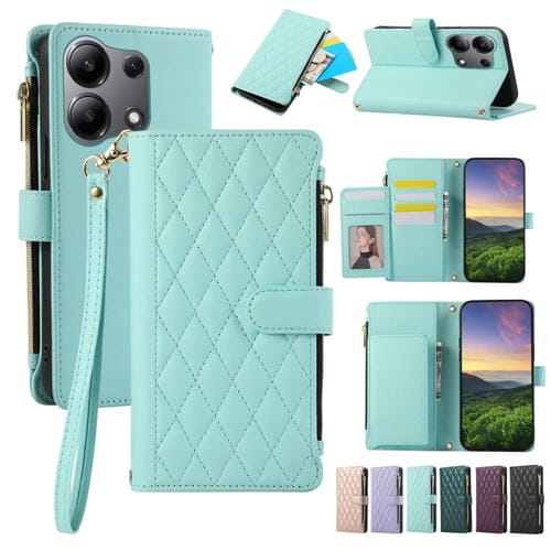 Funda de Cuero Tipo Billetera con Cremallera Rombal para Redmi Note 13 4G (Cian)