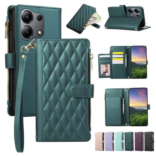Funda de Cuero Tipo Billetera con Cremallera Rombal para Redmi Note 13 4G (Verde)