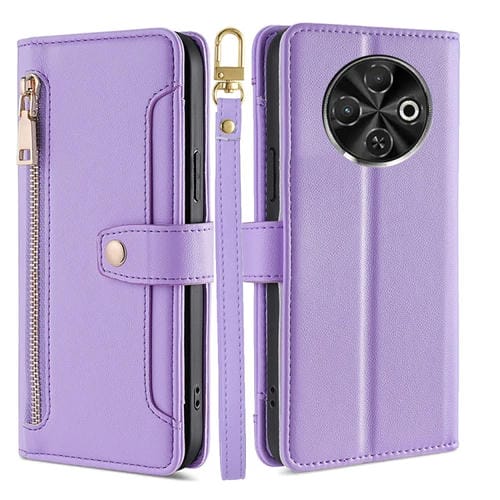 Funda de Cuero Tipo Billetera con Cremallera y Textura de Oveja para Tecno Spark 30C 4G (Morado)