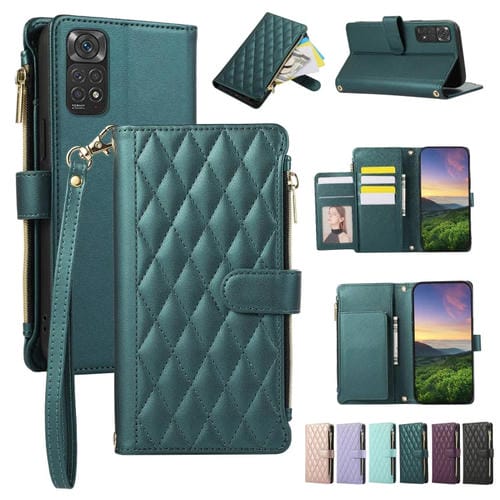 Funda de Cuero Tipo Billetera con Cremallera y Diseño Rombal para Redmi Note 11S (Verde)