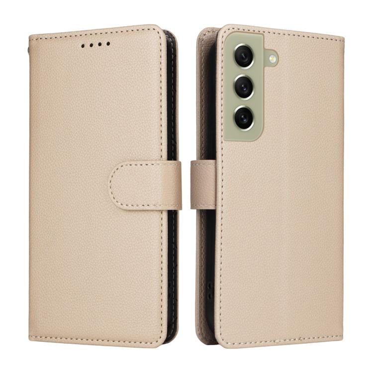 Funda de cuero tipo billetera con textura Litchi y bloqueo RFID para Samsung Galaxy S21 FE 5G (beige)
