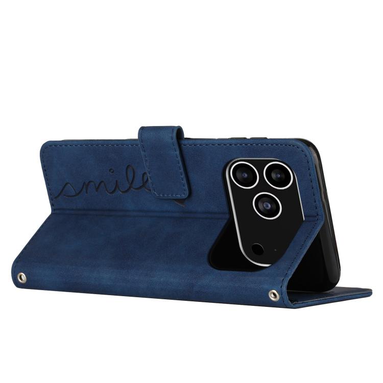 Funda de piel con relieve de corazón para iPhone 17 Pro con cordón largo (azul)