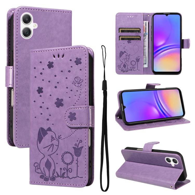 Funda de piel con tapa y diseño de gato y abeja para Samsung Galaxy A07 5G (morada)
