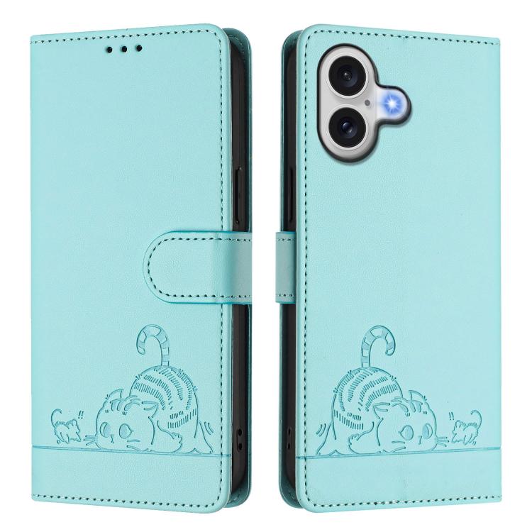 Funda de piel RFID con estampado de gato y rata para iPhone 17 con cordón (verde menta)