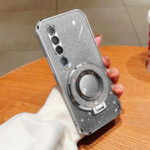 Funda de Teléfono de TPU con Soporte Redondo y Purpurina Degradada Plateada para Xiaomi Mi 10 (Plateada)