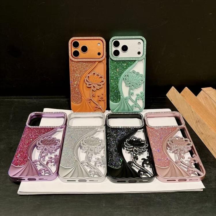 Funda para iPhone 17 Pro Max de TPU electrochapado con diseño de loto calado y purpurina de diamantes de imitación (plateada)