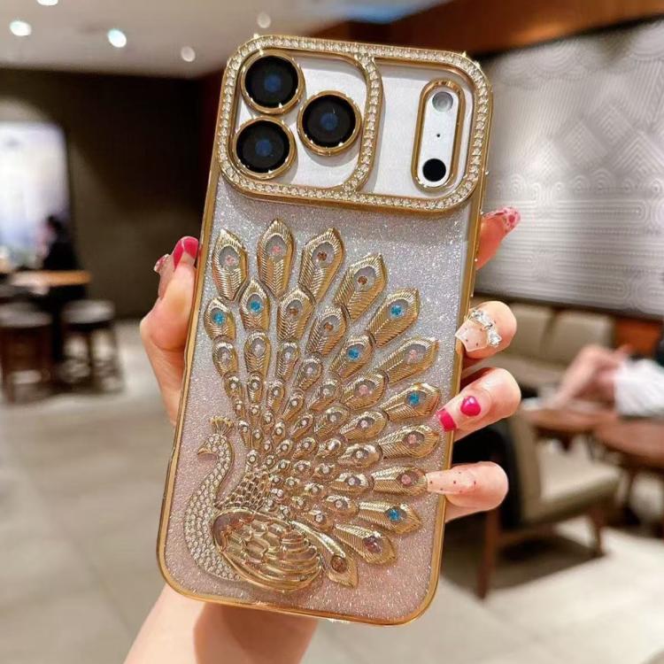 Funda para iPhone 17 Pro Max de TPU electrochapado con relieve de pavo real y purpurina de diamantes de imitación, con protector de lente (dorado).
