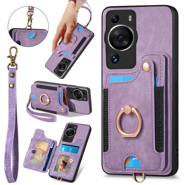 Funda para Teléfono Huawei P60 Pro con Billetera MultiTarjeta Diseño Retro Piel Sintética y Anillo (Morado)
