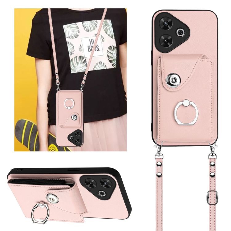Funda para Teléfono con Soporte para Tarjeta de Identificación y Anillo para Redmi 13 4G/5G con Cordón Largo (Rosa)