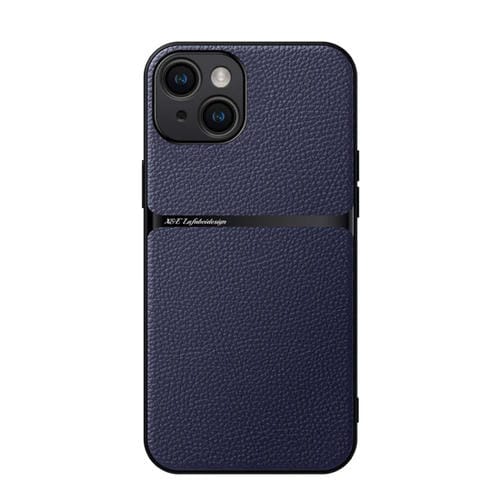 Funda para teléfono iPhone 15 con tapa magnética piel de Lichi a prueba de golpes (Azul Marino)