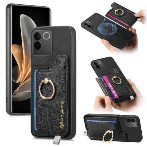 Funda para Teléfono con TaRJetero y Anillo de Cuero con Diseño Retro Magsafe Cross para Vivo S17E / Iqoo Z7 Pro / T2 Pro (Negro)