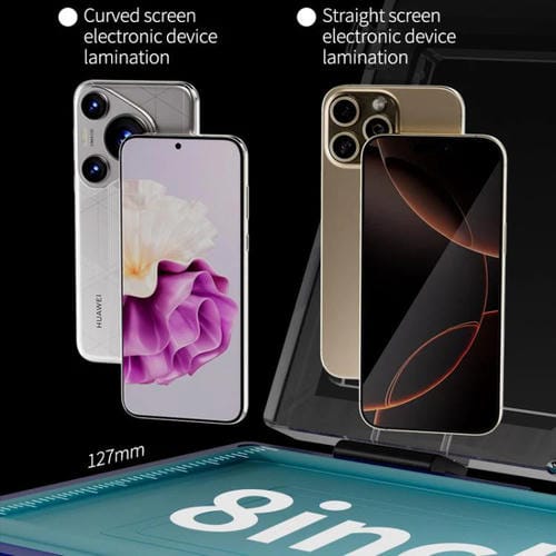 Sí, la Máquina está diseñada para laminar tanto Pantallas rectas como curvas de dispositivos Móviles de menos de 8 pulgadas. -