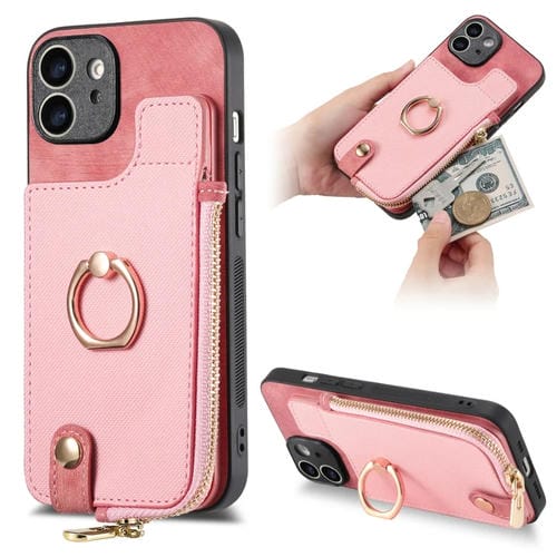 Estuche para Teléfono iPhone 11 con Billetera, Cremallera Vertical y Anillo de Cuero Cruzado (Rosa)