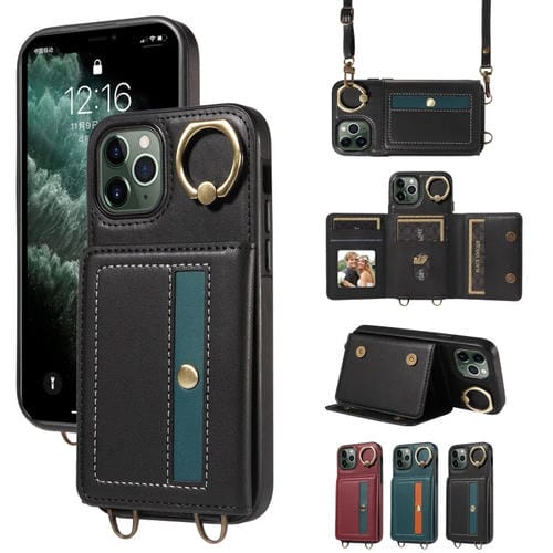 Funda para Teléfono iPhone 11 Pro Cuero Soporte Anillo Bolso Cruzado Tarjetas (Negro)