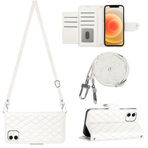 Funda para Teléfono iPhone 12/12 Pro Cuero Textura Rómbica Tapa Cordón Largo (Blanco)