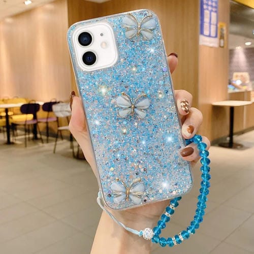 Funda para Teléfono TPU Epoxi iPhone 12 Mariposa de Jade Lentejuelas Estrelladas con Correa (Azul)