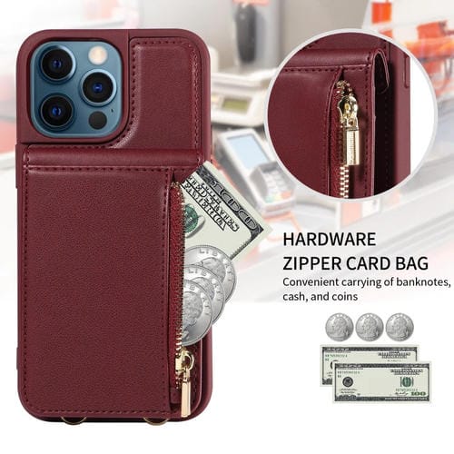 Funda de Cuero Crossbody Lanyard Zipper Wallet para iPhone 12 Pro Max (Rojo Vino)