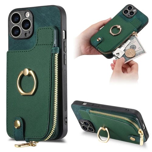 Estuche para Teléfono iPhone 12 Pro Max con Billetera Cremallera Vertical y Anillo de Cuero Cruzado (Verde)