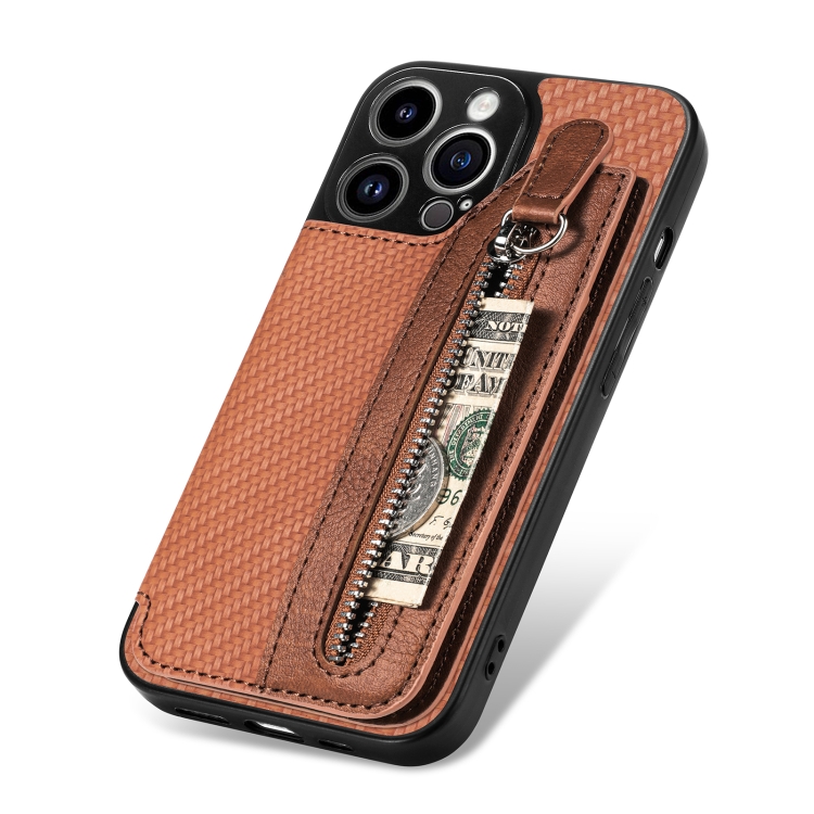 Funda para iPhone 13 Pro Carbon Fiber Horizontal Flip Zipper Wallet Phone Case (Marrón)