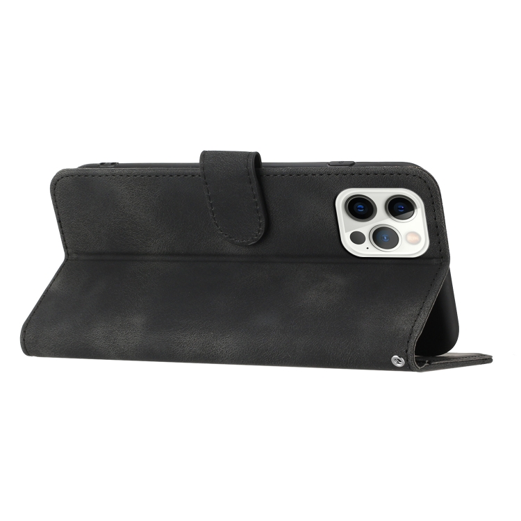 Funda para iPhone 13 Pro Skin Feel Leather con patrón de corazón (Negro)