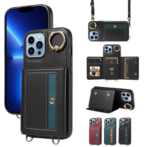 Bolso Cruzado para iPhone 13 Pro Max Funda de Cuero con Soporte para Anillo y Tarjeta (Negro)