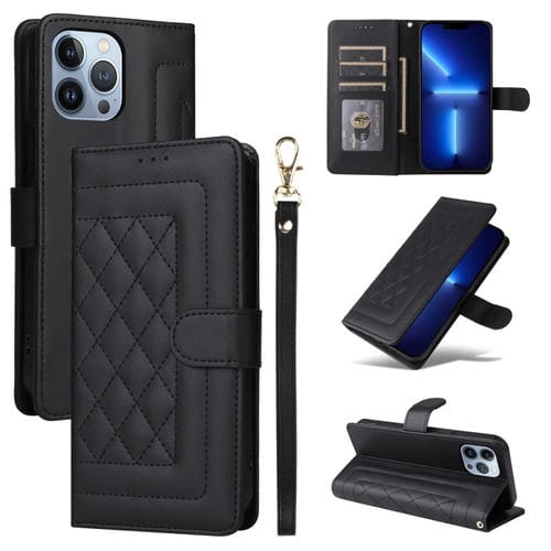 Funda para iPhone 13 Pro Max Diamond Lattice de Cuero con Tapa (Negro)