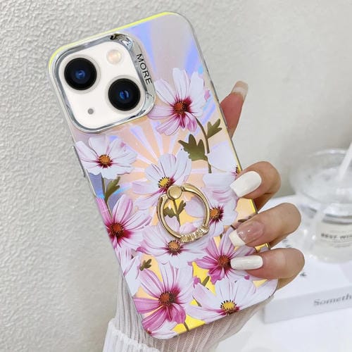 Caja de Teléfono TPU para iPhone 14 con Soporte de Anillo y Flor Láser de Galvanoplastia (Cosmos Flower Ah7)
