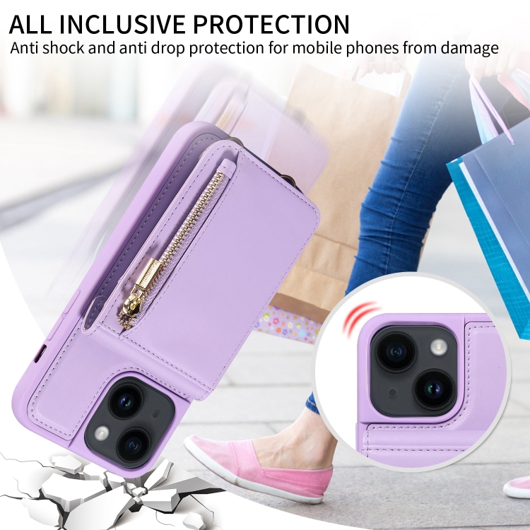 Funda para iPhone 14 Crossbody Lanyard Zipper Wallet de Cuero para Teléfono (Púrpura)