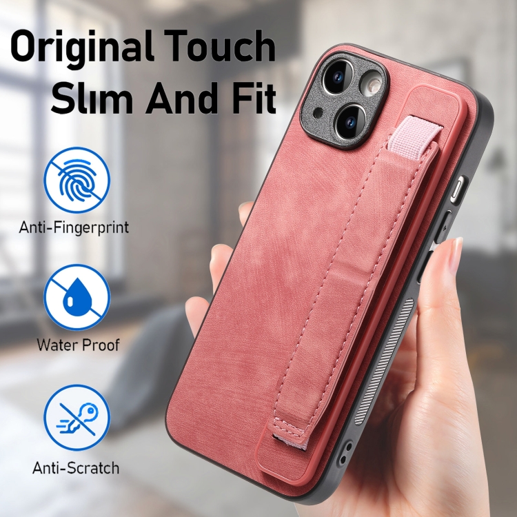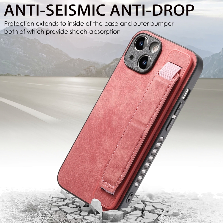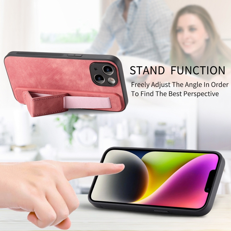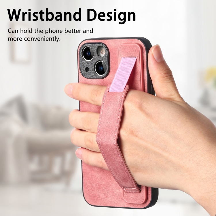 Funda Trasera para iPhone 14 de Cuero con Soporte para Pulsera Retro (Rosa)