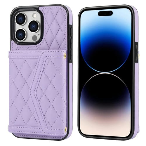Estuche para Teléfono iPhone 14 Pro Bolsa para Tarjetas Textura Rómbica Empalme Cordón Largo (Púrpura)
