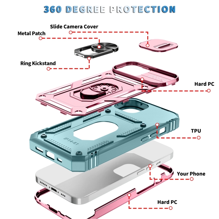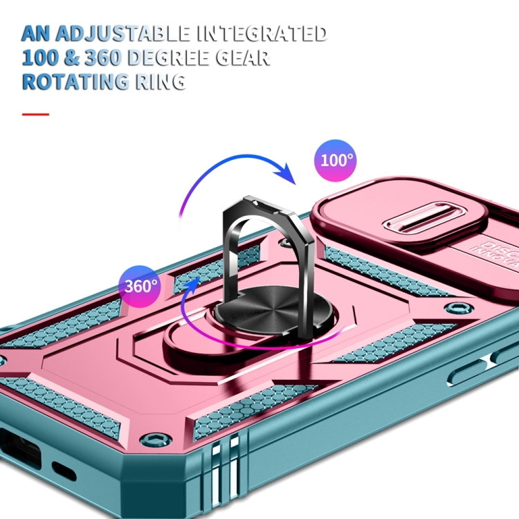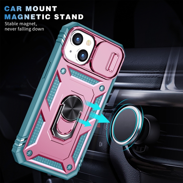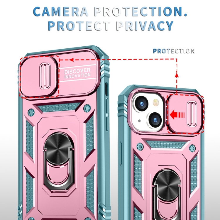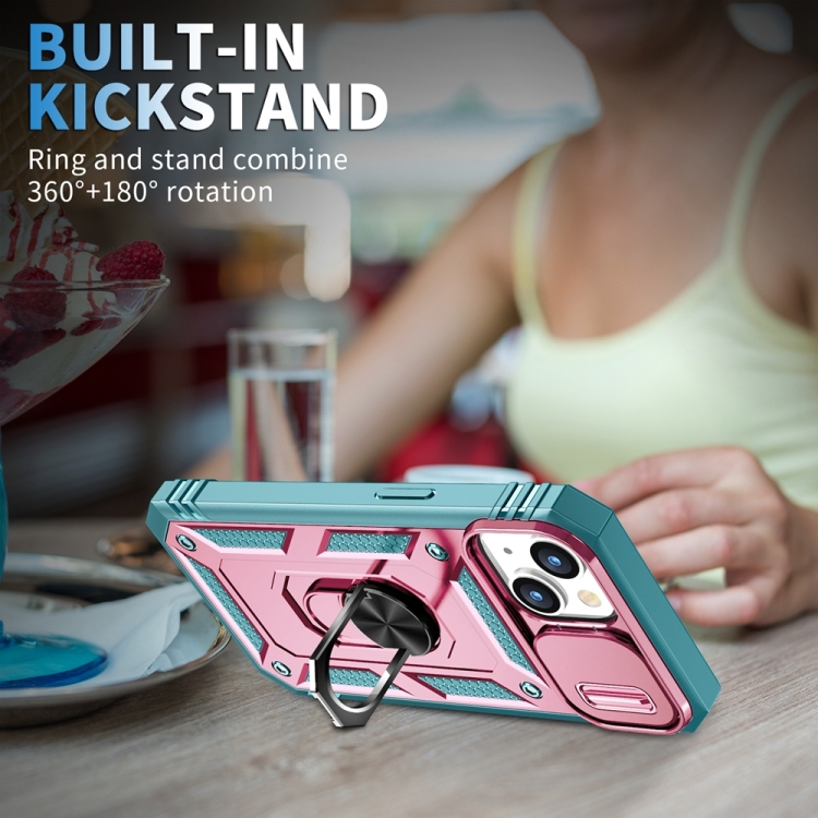 Estuche para teléfono iPhone 15 con soporte deslizante Camshield (Rosa + Verde)