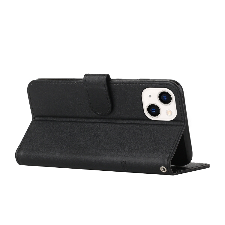 Funda de teléfono iPhone 15 cuero con hebilla textura de becerro cosida (Negro)