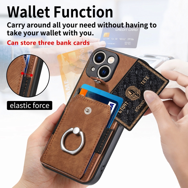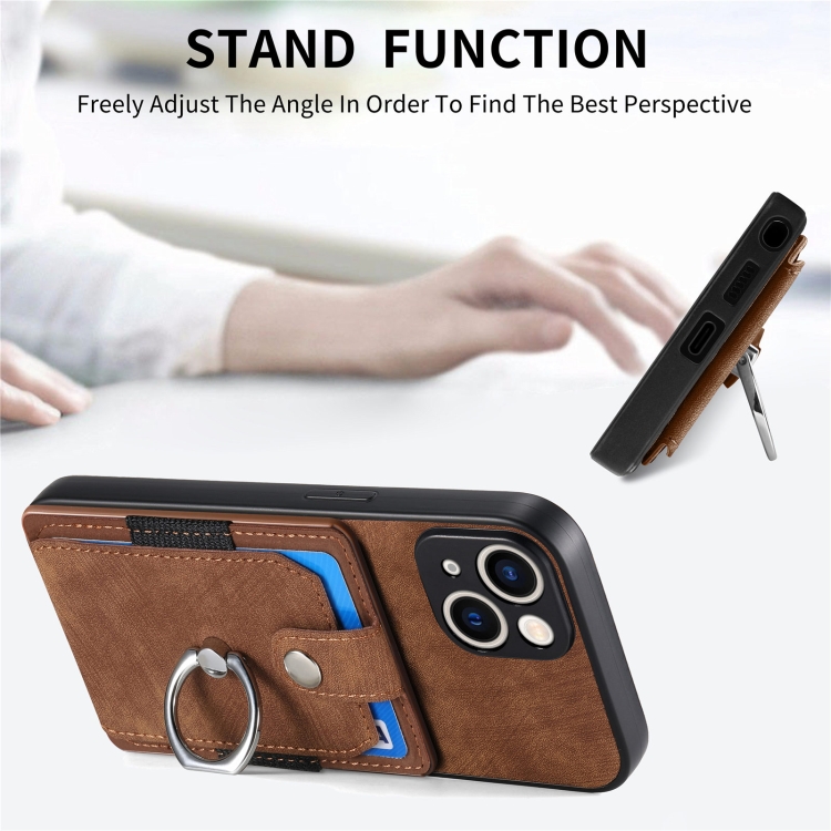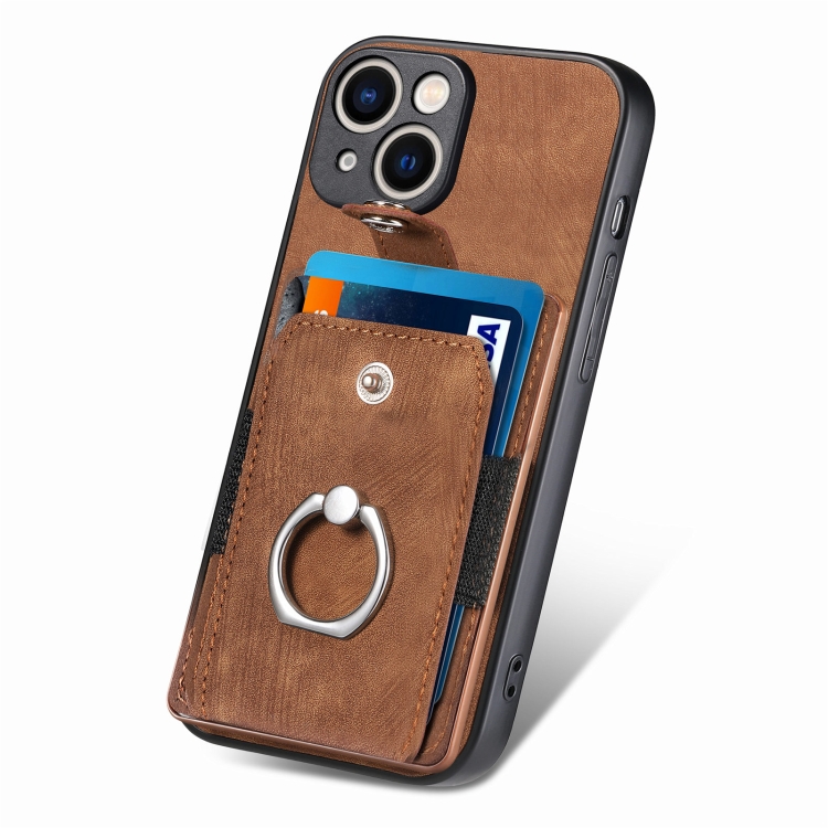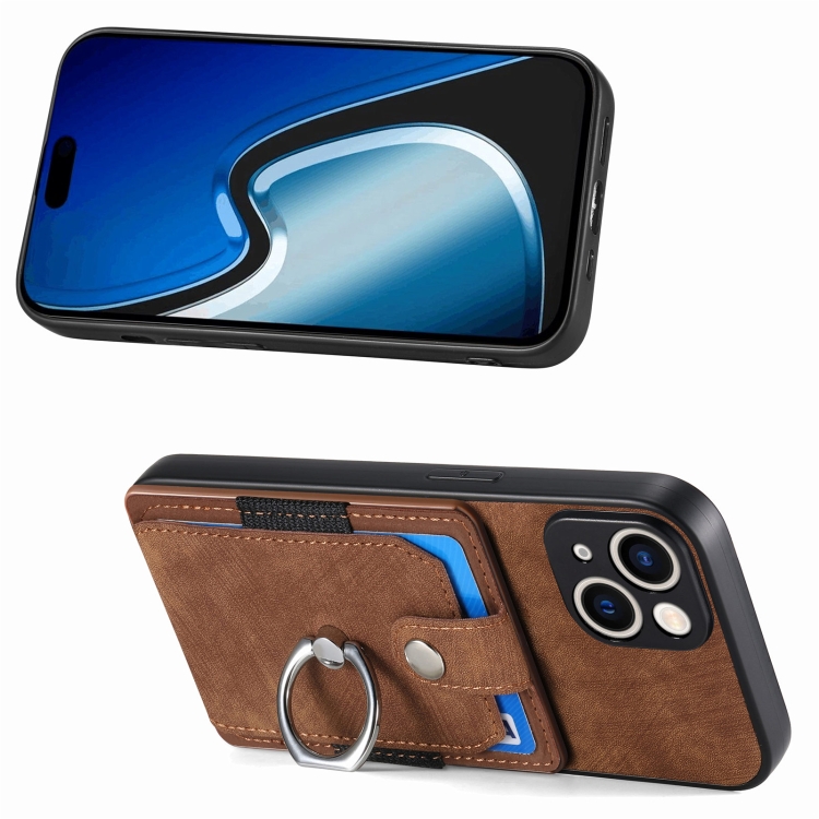 Funda para Teléfono iPhone 15 con Billetera, Tarjeta, Anillo y Sensación de Piel Retro (Marrón)
