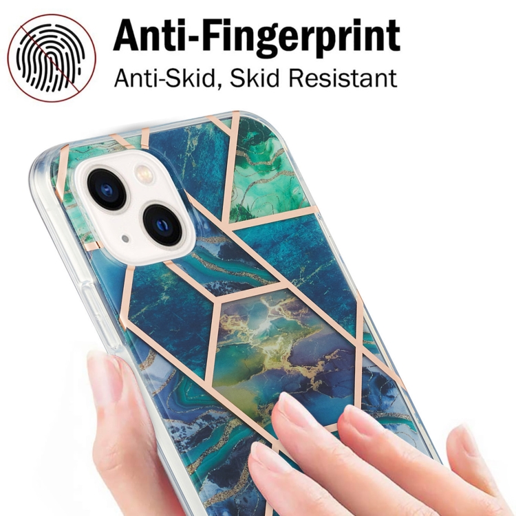 Funda para iPhone 15 Galvanoplastia Empalme Mármol Patrón de Flores Doble Cara Imd TPU a Prueba de Golpes (Azul Verde)