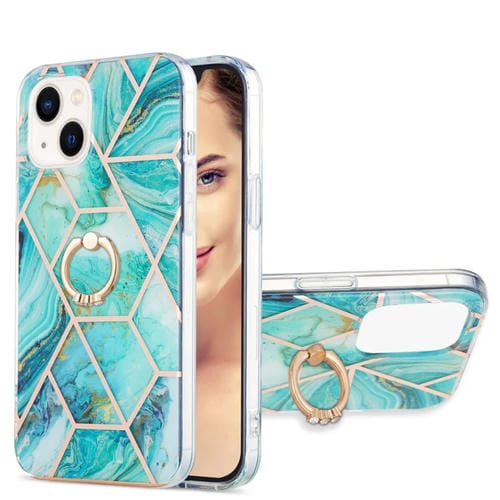 Estuche para iPhone 15 Galvanoplastia Empalme Mármol Patrón Imd TPU a Prueba de Golpes con Soporte para Anillo (Azul)