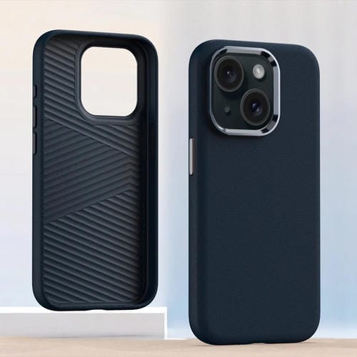 Estuche para Teléfono iPhone 15 Plus Cuero Marco de Lente Metal (Azul)