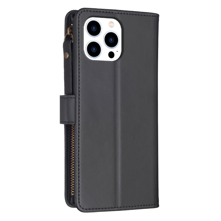 Funda Cartera para iPhone 15 Pro 9 Ranuras para Tarjetas Cremallera Cuero con Tapa (Negro)