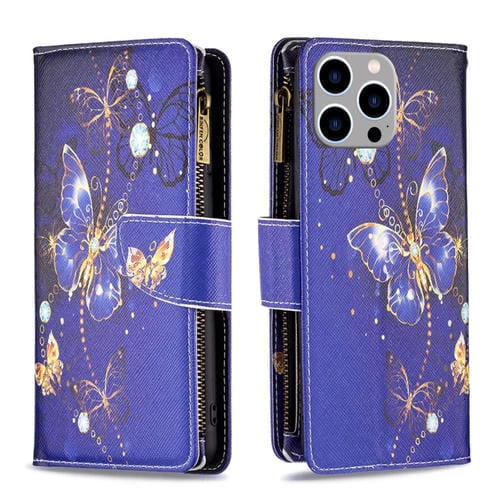 Funda de Cuero para iPhone 15 Pro Max con Cremallera y Patrón de Dibujo Coloreado (Mariposa Púrpura)