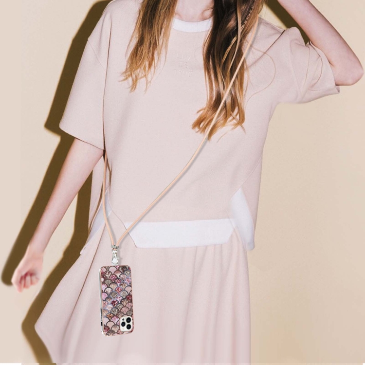 Estuche TPU para iPhone 15 Pro Patrón de Galvanoplastia Imd a Prueba de Golpes con Cordón para el Cuello (Escamas Rosas)
