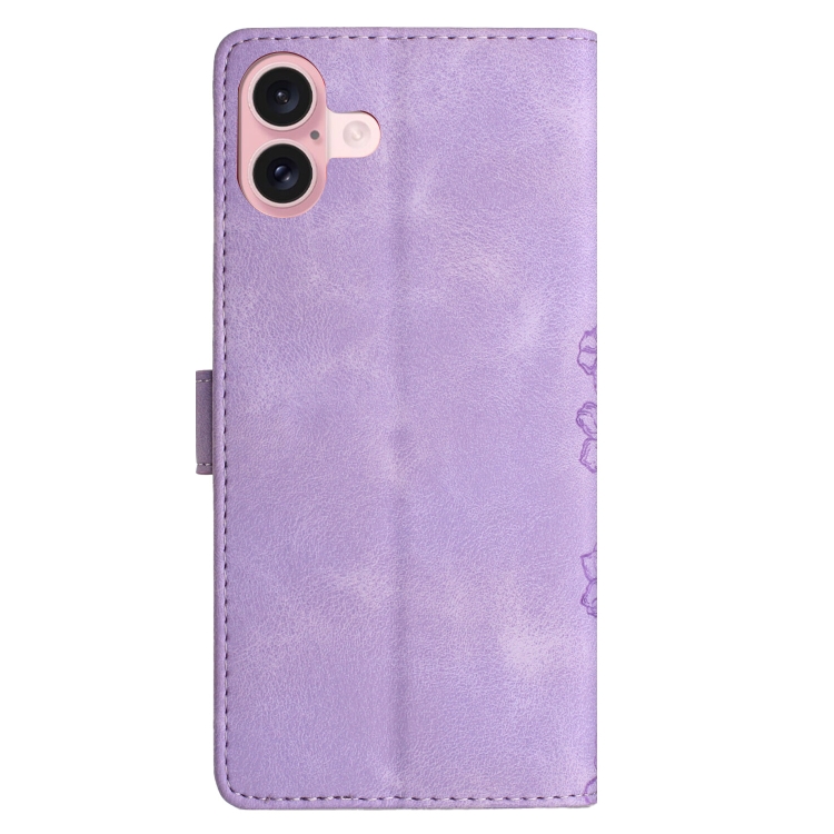 Funda para Teléfono iPhone 16 PU Sensación de Piel Mariposa y Flor de Cerezo En Relieve (Púrpura)