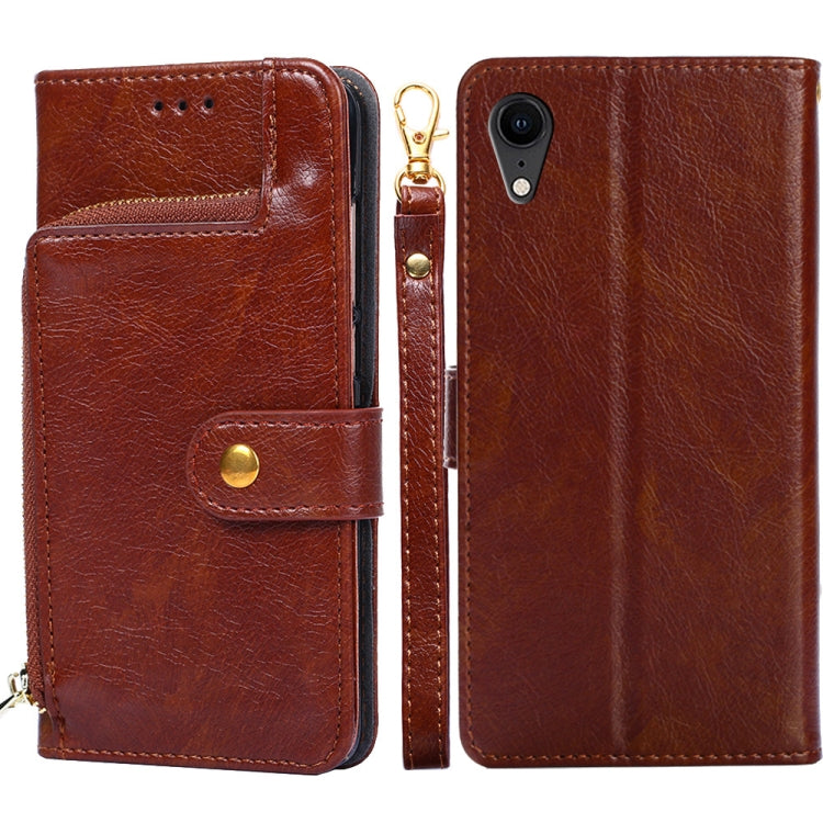 Funda para iPhone Xr Bolsa con Cremallera PU y TPU con Tapa Horizontal Soporte Ranura Tarjeta Billetera Cordón (Marrón)